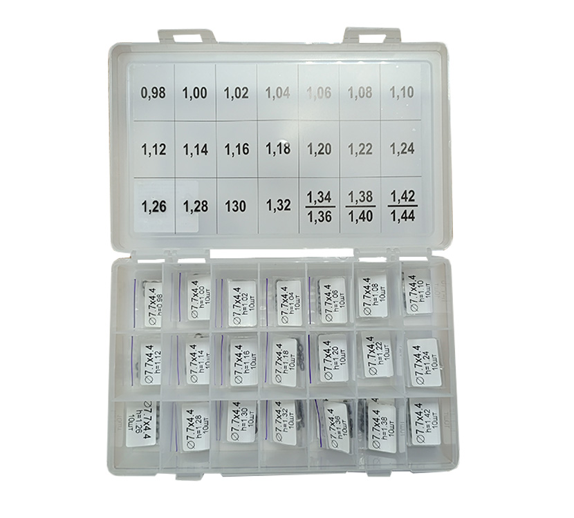 Set of adjustment shims, Ø = 4.4 x 7.7 mm, H = 0.98-1.44 mm, Step = 0.02 mm, 24 sizes.