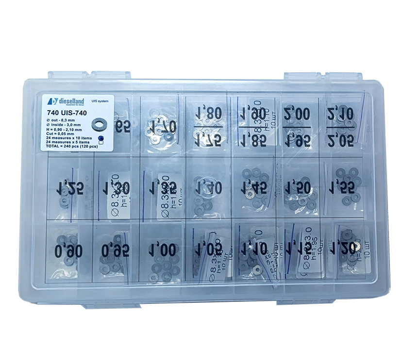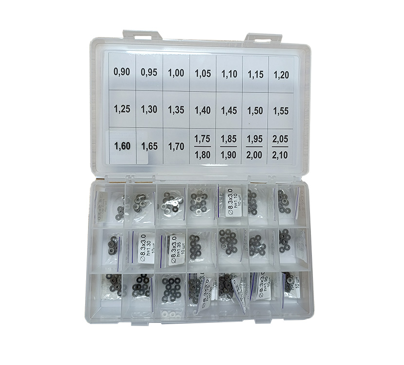 Set of adjustment shims for UIS, Ø8.3 x 3.0 mm; H = 0.90-2.10 mm; step 0.05 mm, 24 sizes.