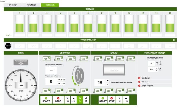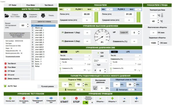 To test the CP2 pumps, the controller has the ability to use three HP1-HP3 high pressure regulators, since these pumps have a large capacity and the flow area of one regulator is not enough to regulate the pressure in the test system.To carry out the necessary tests of the injection pump, the controller allows you to control the following parameters:· In automatic mode, control the HP1-HP3 high pressure regulator (s) (1-3 pcs), thereby maintaining the pressure in the system from the minimum to the maximum value;· In manual mode, operate the LP1-LP2 low pressure regulator (s) (two regulators are used when testing CP2 cargo pumps).