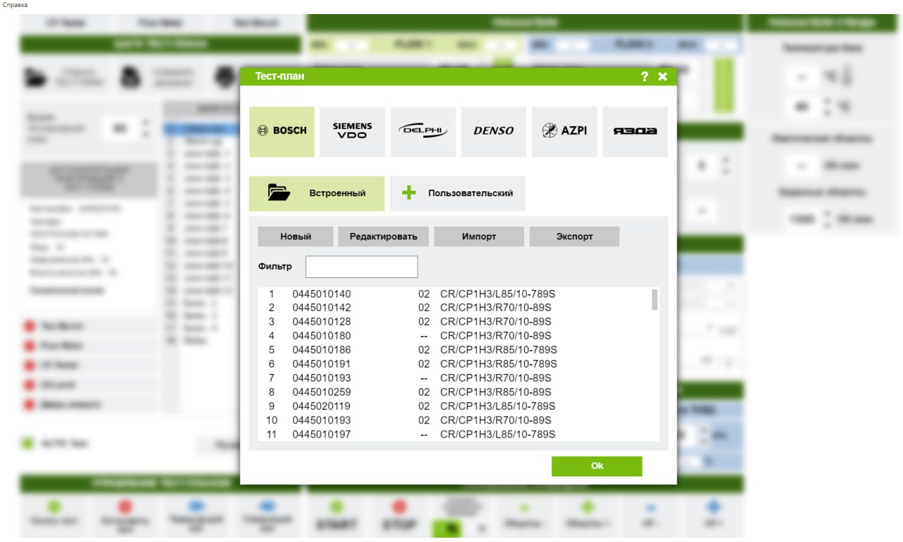 The principle of testing CP3 pumps is as follows: a pressure accumulator (Rail) with high pressure regulators and a pressure sensor installed on it is used as a load. In these low pressure controlled systems, the pump will have maximum performance when there is no voltage to the regulator, but since the Rail is equipped with a high pressure regulator (s), all fuel will go back to the drain. Further, in the automatic mode, the load pressure is set by the HP high pressure regulator (s), and by closing the LP low pressure regulator with a current of various frequencies, the pump performance is measured (the amount of fuel that goes into the return from the rail through the high pressure regulator (s) in different operating modes) …When testing the CP2 pumps, the same principle is used as the CP3. Rail is used as a load, shutting off the low pressure regulators, the pump capacity is measured. By alternately closing the regulators, the uniformity of the operation of the pump sections is checked.